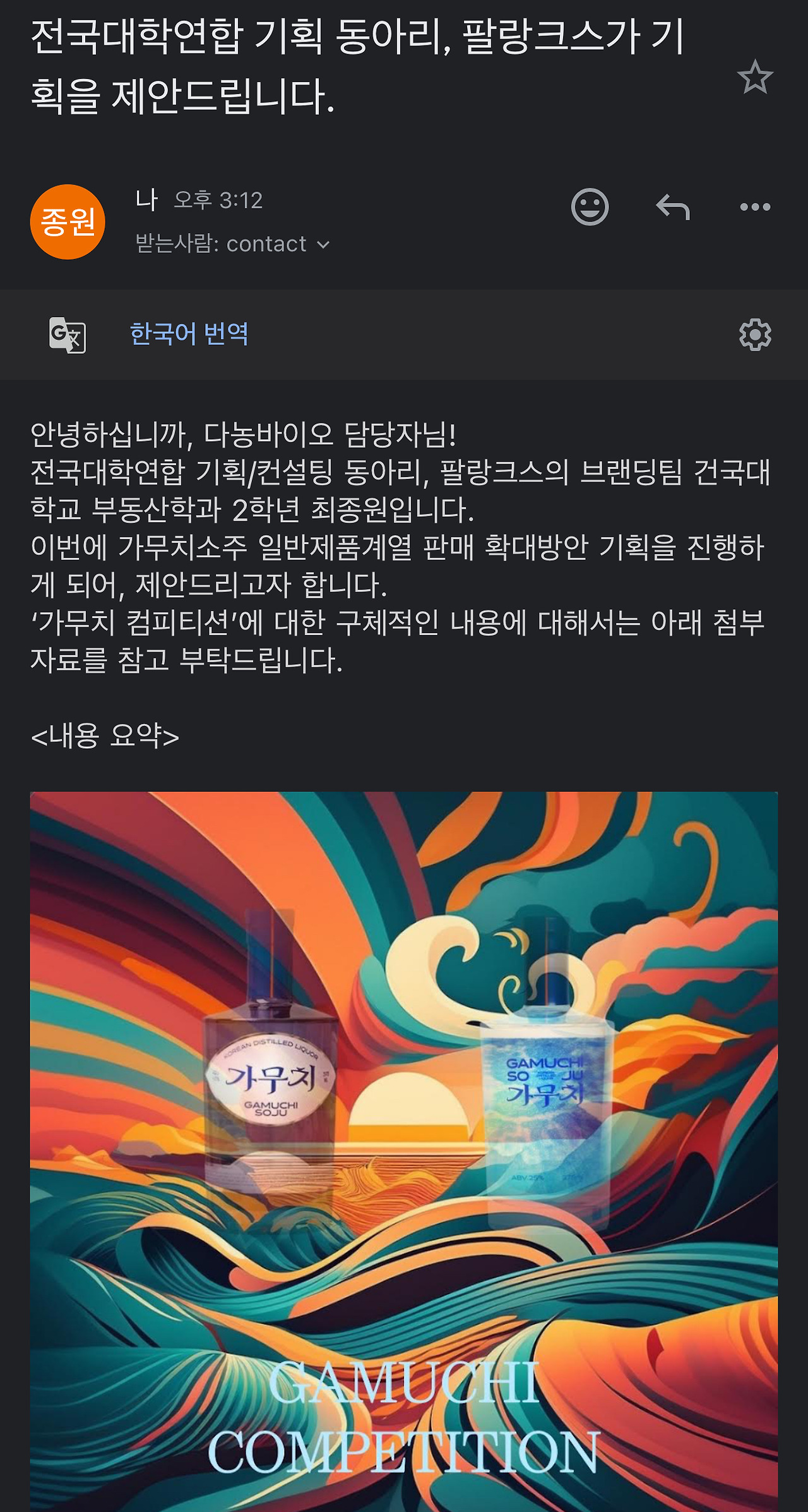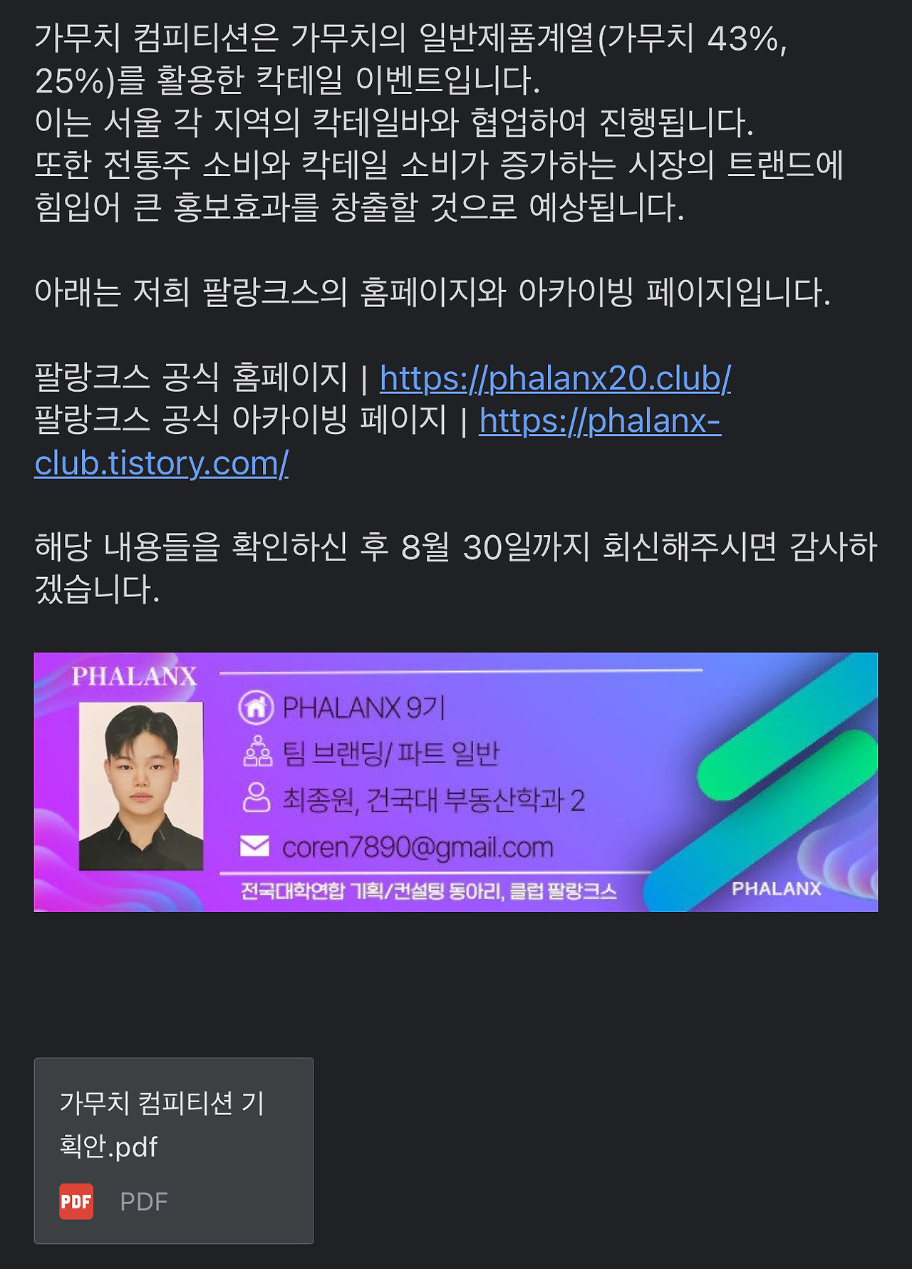 안녕하세요! 칵테일 이벤트인 가무치 컴피티션을 주제로 기획안을 작성해온 브랜딩팀 최종원입니다.