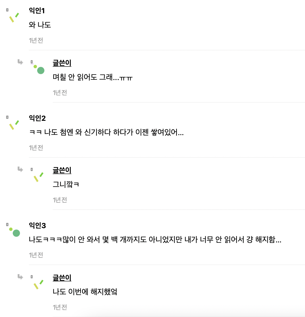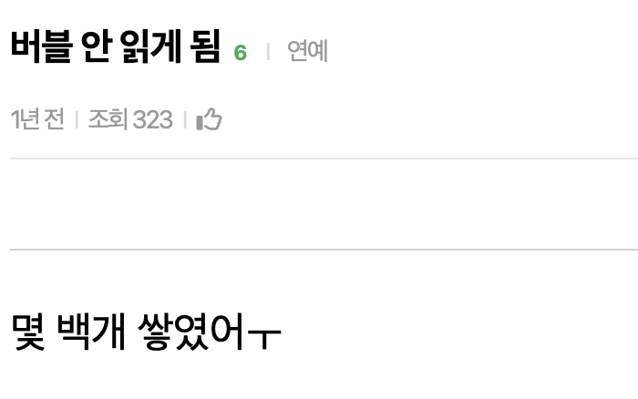 아래 사진은 한 커뮤니티에서 디어유 버블에 대해 구독자들이 나눈 대화입니다. 이와 같이 많은 팬(구독자)들이 구독한 아티스트의 버블을 읽지 않고 쌓아두는 경우가 적지 않은 것으로 확인됩니다. 3년째 버블을 구독하고 있는 저(글쓴이)의 경우에도 최근 들어서 버블 알림이 떠도 잘 읽지 않고 메시지가 100~200개씩 쌓일 때까지 방치하게 되는 경우가 종종 있습니다.