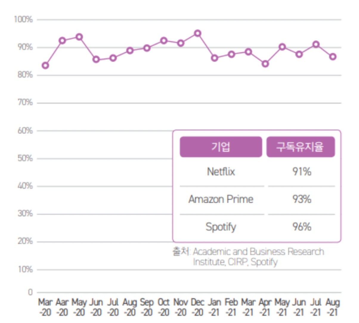디어유 버블이 가지는 두번째 강점은 높은 구독 유지율입니다. 디어유 버블은 1인권 기준 월 4500원으로 판매되고 있는 유료 서비스이지만 상당히 높은 구독 유지율을 기록하고 있습니다. 2021년 공개된 버블 구독 유지율을 살펴보면 대략 90%의 수치를 유지하고 있는 것을 확인할 수 있습니다.