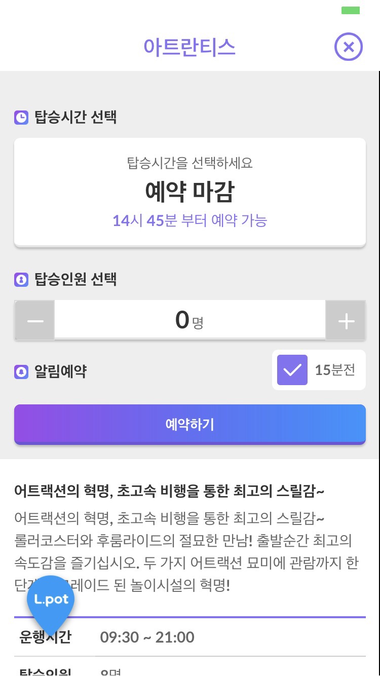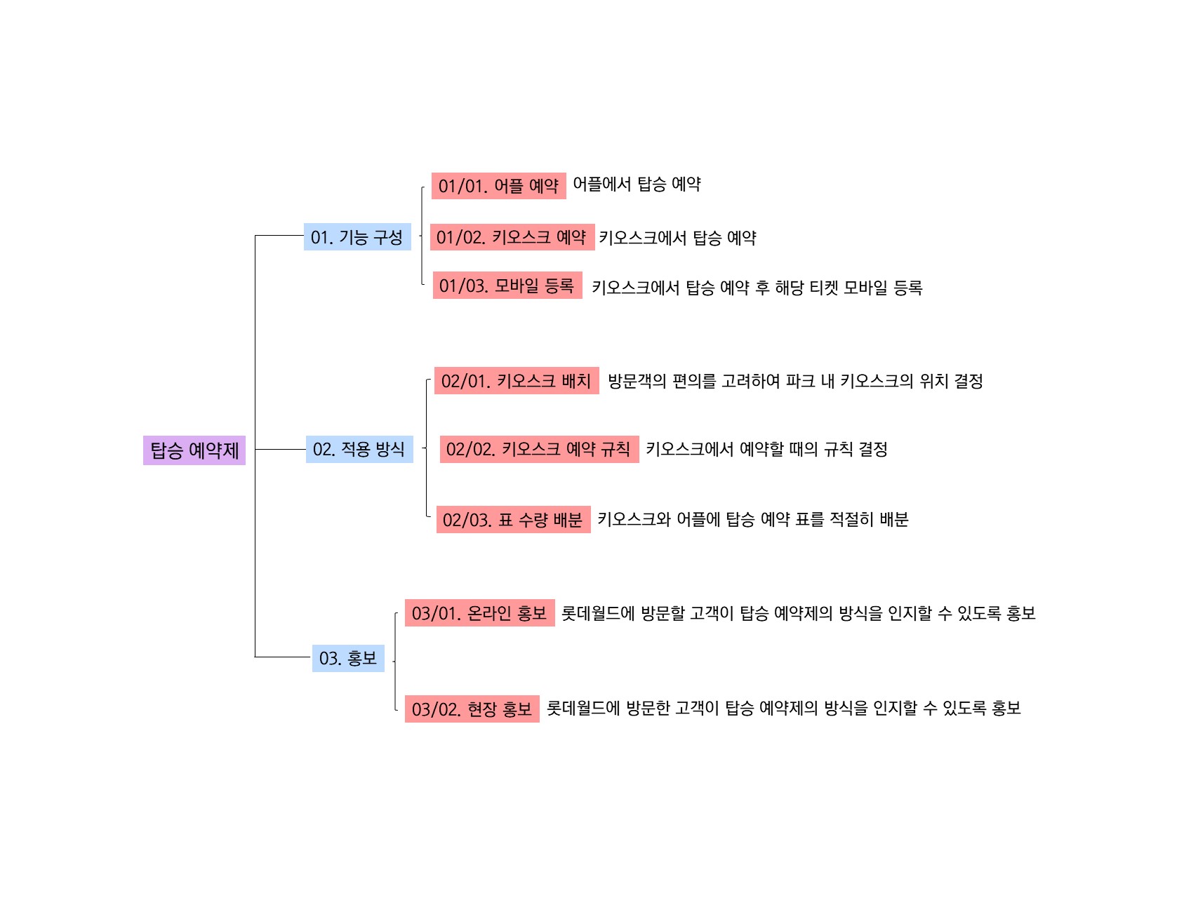 1순위, 어플 예약 01/01: 본 기획안에서 탑승 예약의 주가 되는 수단은 롯데월드 어드벤처 어플이기 때문에 어플의 기능 구성이 가장 핵심적으로 고려되어야 한다고 생각했습니다.