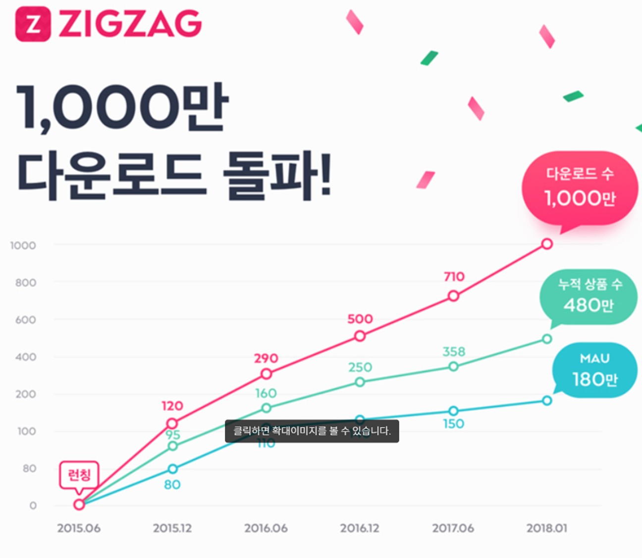 '지그재그'는 2015년에 런칭되어 2년 뒤인 2017년에 다운로드 수가 710만을 뛰어넘는 기록을 선보였으며, 이는 현재 '위시버킷'의 71배에 달하는 수치입니다.