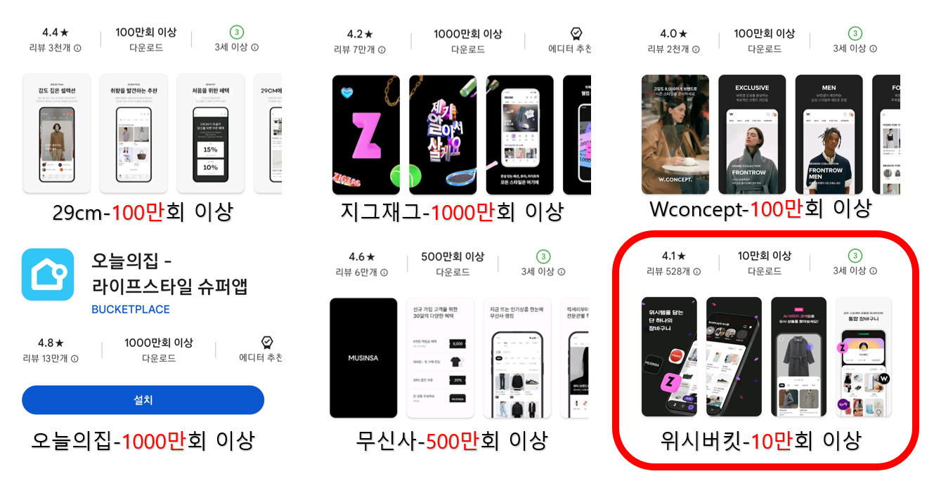 가장 비슷한 플랫폼인 타쇼핑몰앱들과의 앱 다운로드 수를 비교했을 때, 위시버킷은 최소 10배~최대 100배 이상 다운로드 수가 현저히 낮다는 걸 알 수 있습니다.