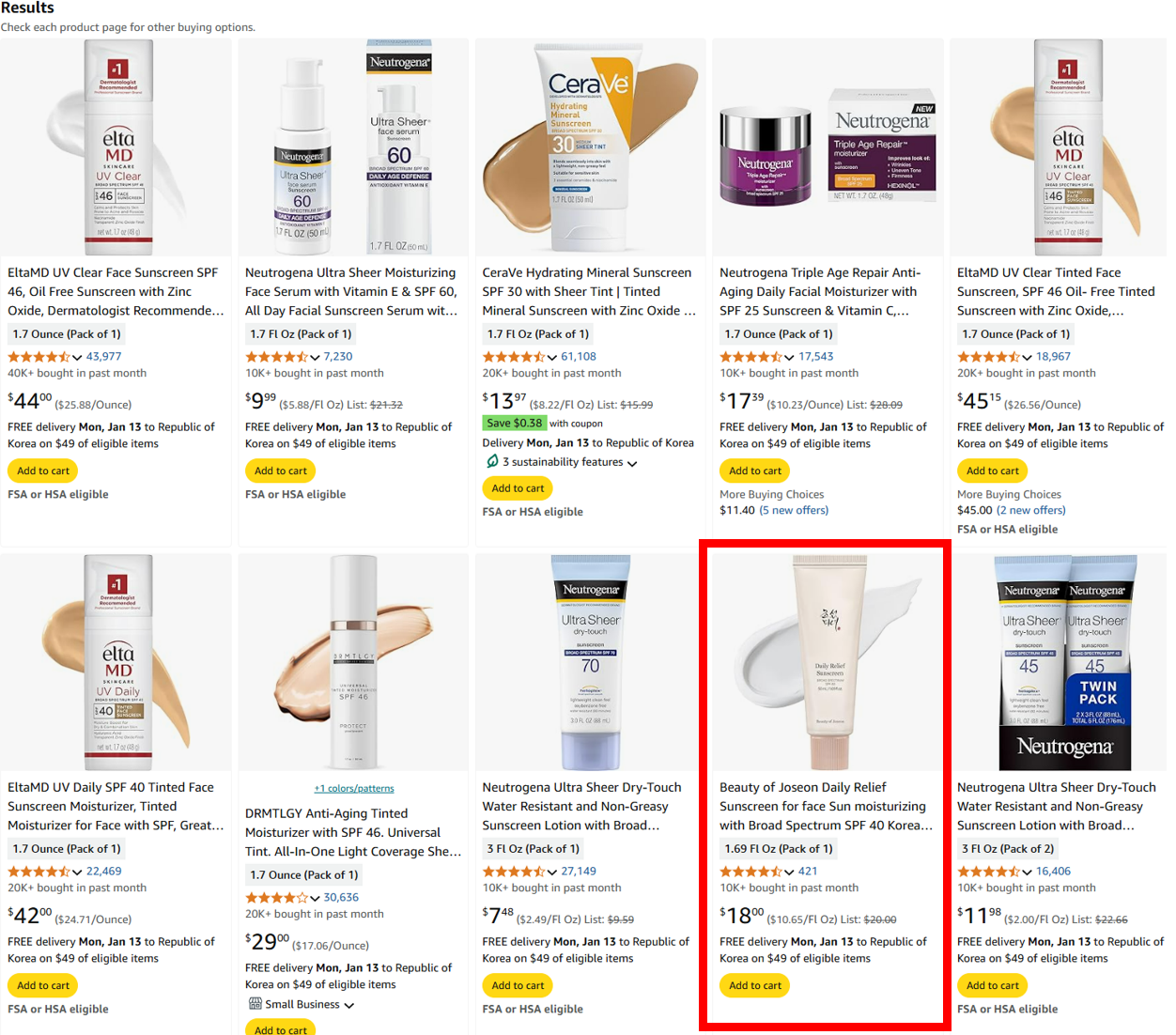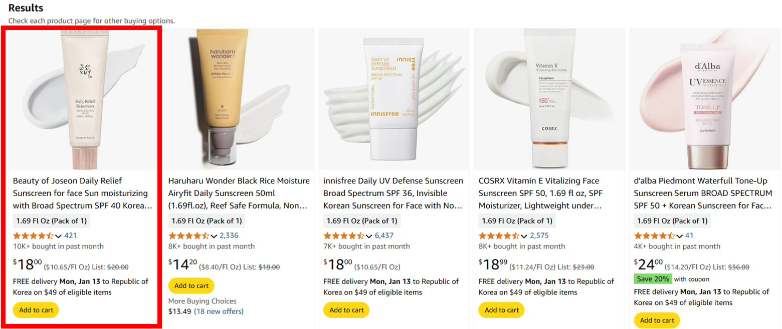 아마존에 단순히 Sunscreen을 검색하고, bestseller 순으로 정렬을 하였을 때