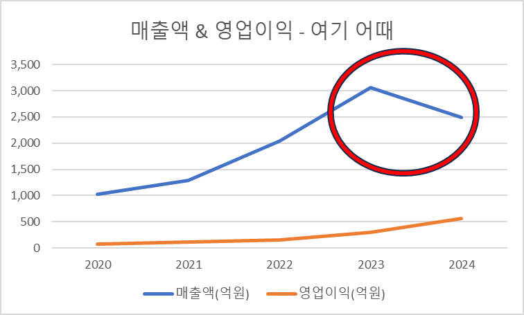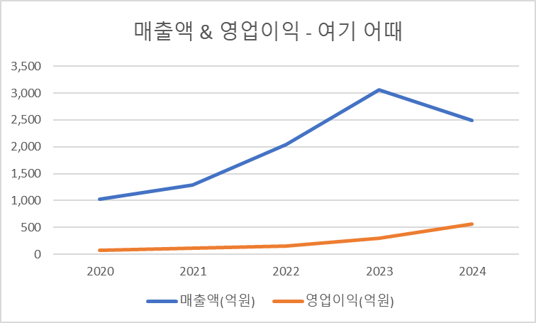20년부터 24년까지 쭉 상승그래프를 그려온 여기 어때와 달리 야놀자는 22, 23년에 낮은 영업이익을 기록했습니다.