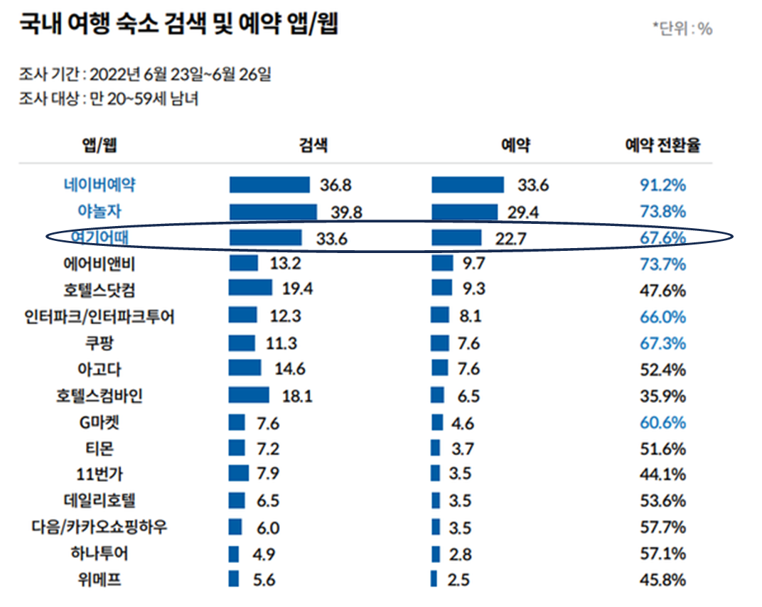 국내 여행 숙소 및 예약 앱 예약 전환율 추이를 보면 여기 어때의 예약률은 4위에 머물고 있습니다.