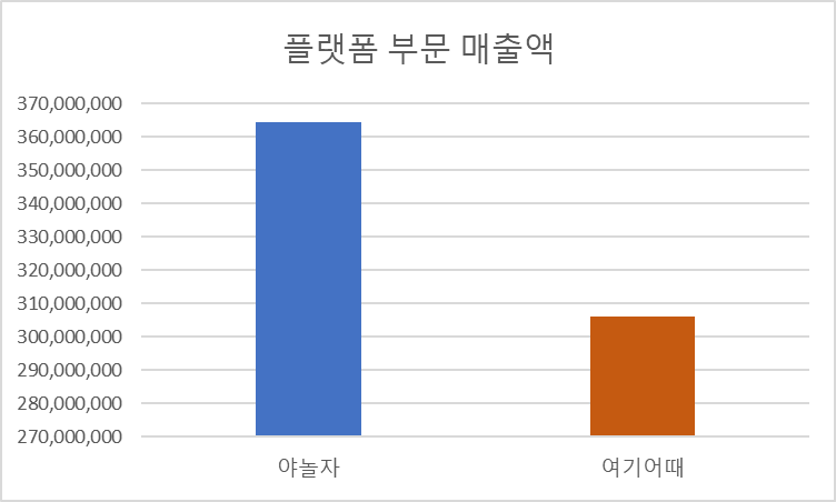 총 매출액 뿐만 아니라 플랫폼 부문에서도 야놀자 의 매출이 여기 어때 의 매출을 상회합니다.