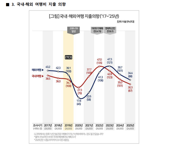 소비자들은 국내여행 보다 해외여행에서 더 많은 비용을 지출하고자 합니다.