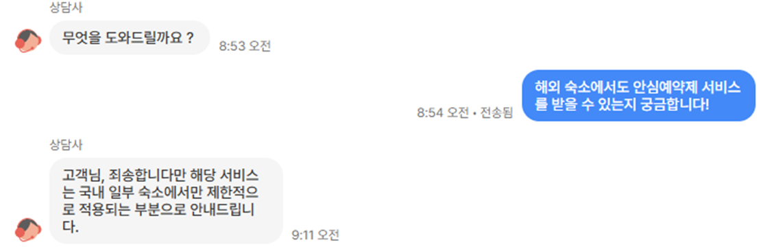 또한 해외 서비스에 대해서는 여기어때가 플랫폼 자체적으로 시행하고 있는 서비스가 없습니다.