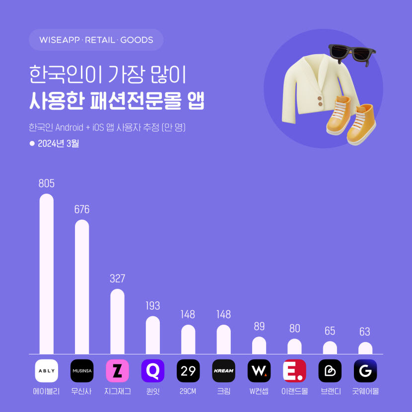 지난달 국내 주요 패션 전문몰 앱 사용자 수가 2천594만명에 달했습니다. 가장 많은 이들이 찾은 패션 전문몰은 에이블리인 것으로 조사됐습니다.