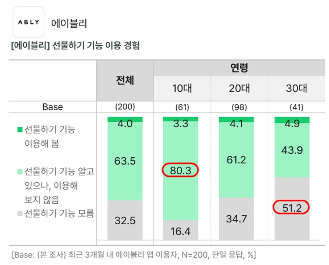 오픈서베이의 온라인 쇼핑 트렌드 리포트 2023에 따르면 에이블리 선물하기 기능을 이용해 본 경험이 있는 사용자는 4%로 매우 낮은 수준으로 나타났습니다. 특히 10대에서는 80%가 넘는 비율이 선물하기 기능을 인지하고 있었으나 사용하지 않았고 30대 사용자 중 51.2%는 선물하기 기능 자체를 모른다고 답변했습니다.