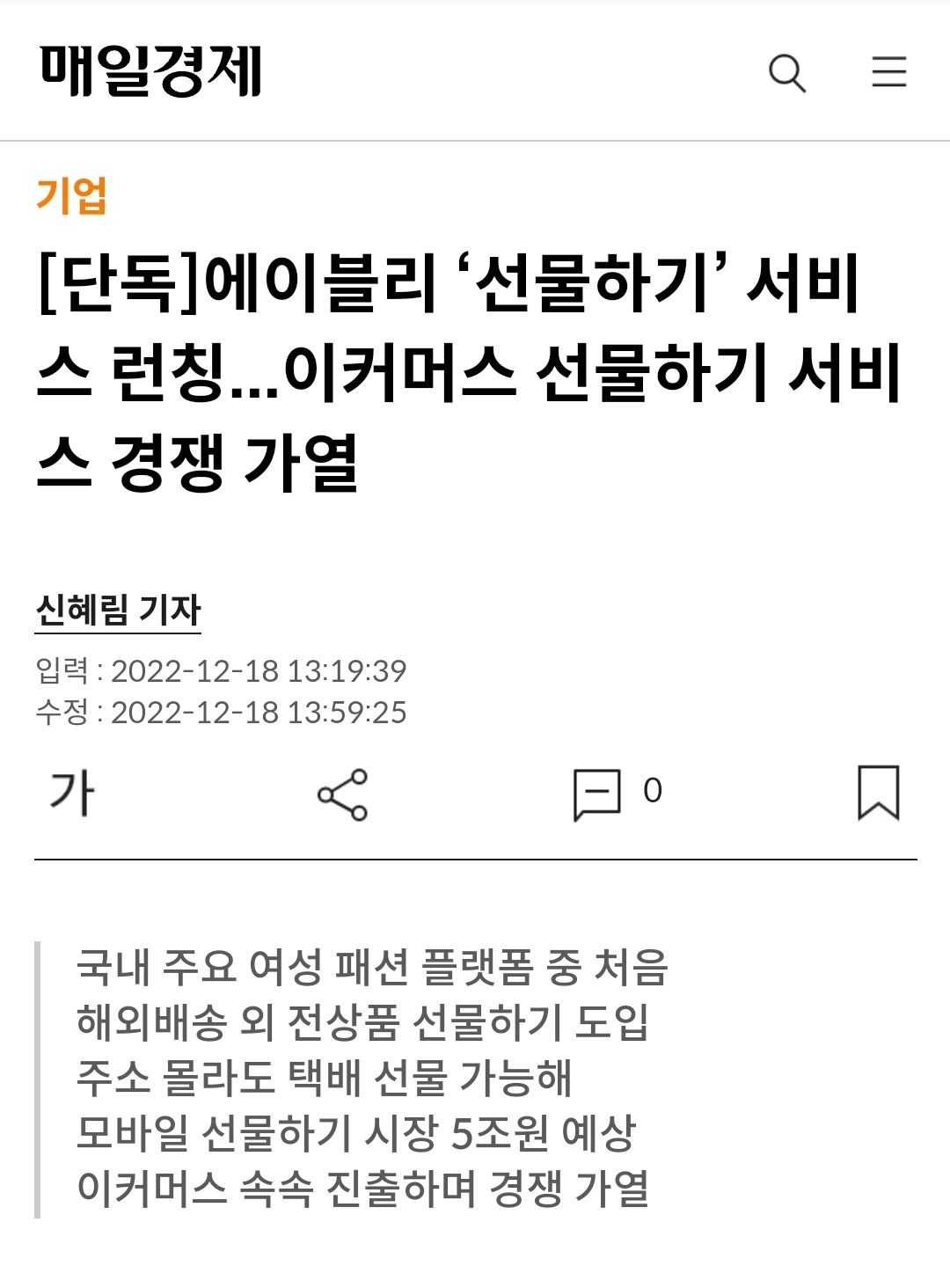 구매 데이터, 검색 데이터, 앱 리뷰 등 다양한 방식으로부터 사용자가 선물을 주고 싶어했다는 구매 패턴을 발견하였습니다. 그 결과 에이블리는 2022년 12월 선물하기 기능을 업계 최초로 도입했습니다.