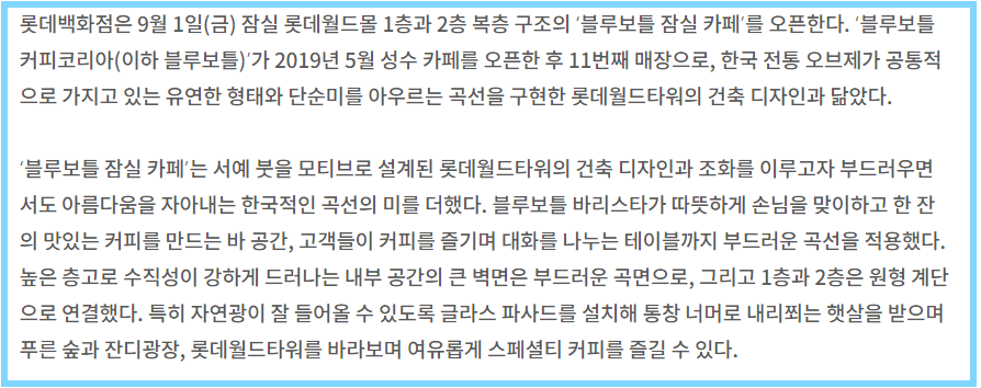 [한국적인 잠실의 블루보틀 카페 오픈] 롯데백화점은 한국 전통 곡선을 구현한 롯데월드타워 디자인과 조화를 이루는 블루보틀 잠실 카페를 9월 1일에 오픈하여 고객들이 자연광을 즐기며 스페셜티 커피를 맛볼 수 있게함.
