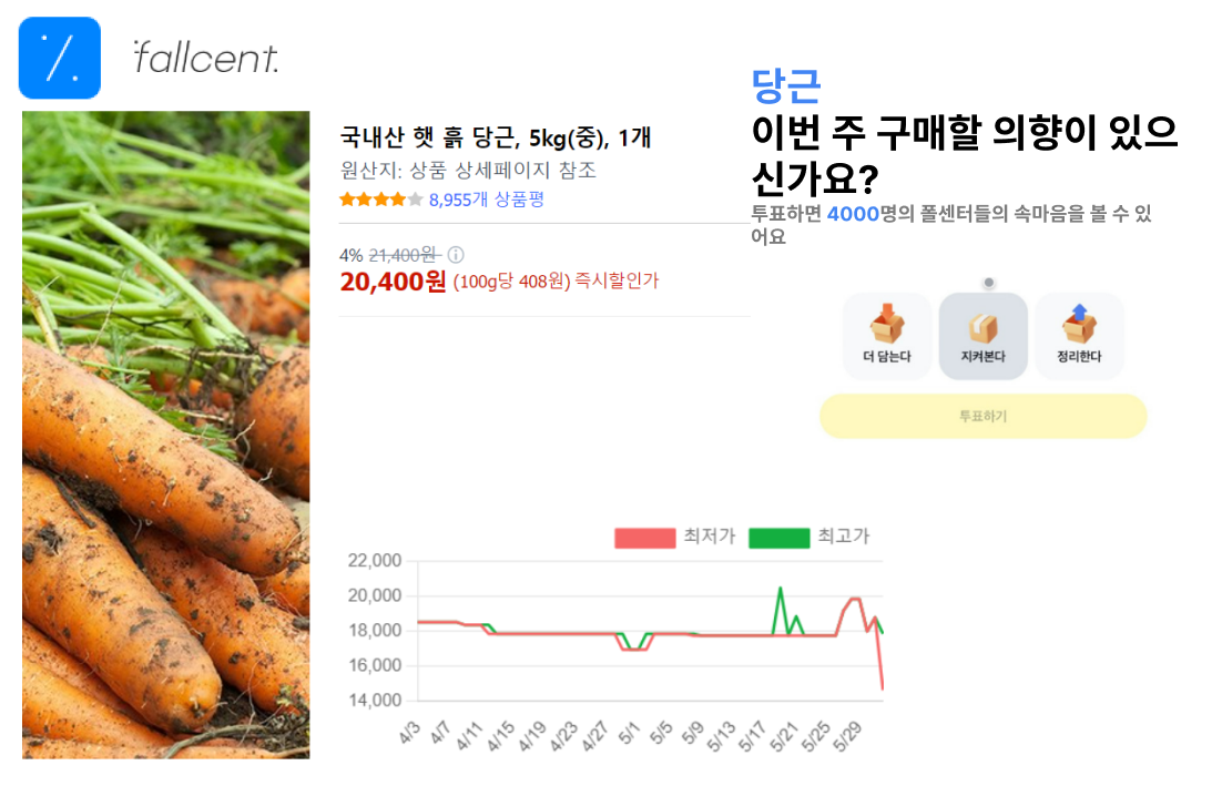 : 쿠팡 등 인터넷 쇼핑물의 시시각각 변하는 물건가격을 차트로 분석해주고 구매까지 가능한 앱입니다. 그러나 이러한 기능들은 타사에서도 폴센트와 유사하게 서비스하기에 저는 커뮤니티 기능을 경쟁사와 구별되는 폴센트만의 차별화 기능으로 선정하게 되었습니다