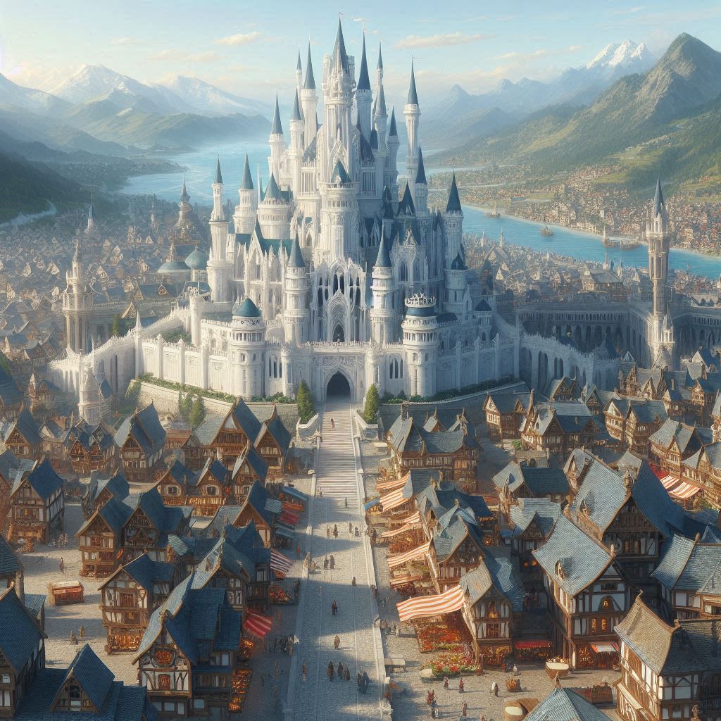(하얗고 큰 성이 가운데에 있고, 성 바깥에는 여러 집들과 시장이 존재하는 판타지스러운 도시)