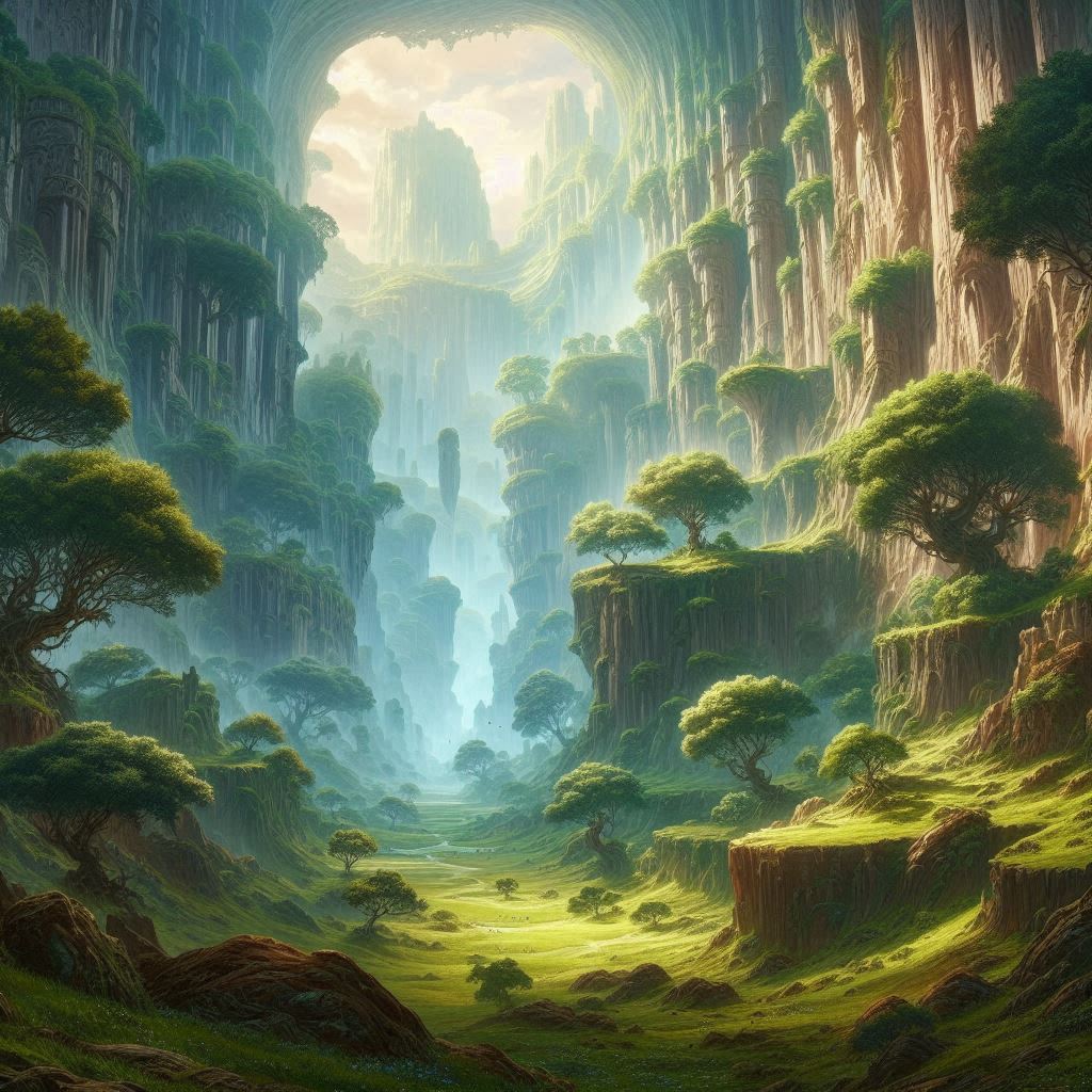 I want a fantasy-like background of a large canyon with lush trees and grass.