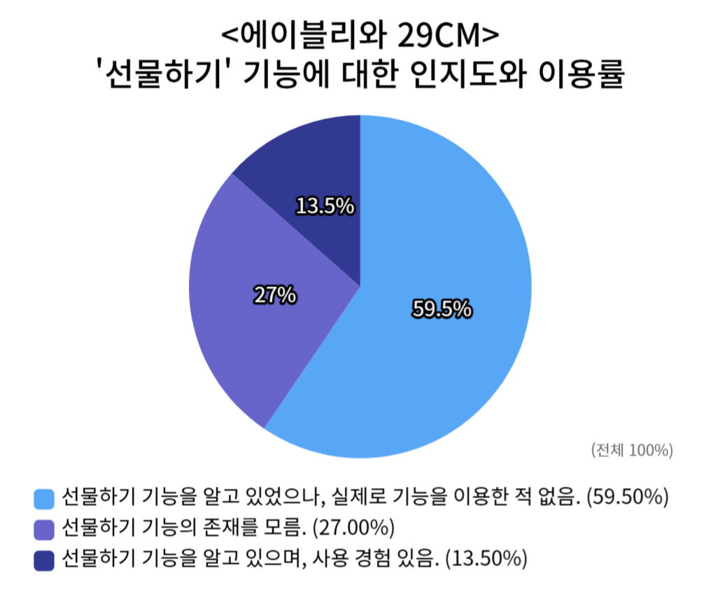 29CM를 이용해 본 적 없는 사람들뿐만 아니라 기존 고객들도 선물하기 서비스를 이용하지 않는다는 것입니다.