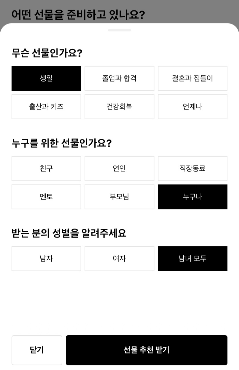 [큐레이션] 부분에서는 '선물 추천받기 서비스'를 제공하며 선물을 받는 사람, 선물을 주는 상황, 세부 취향을 선택하여 상품 탐색을 할 수 있습니다.