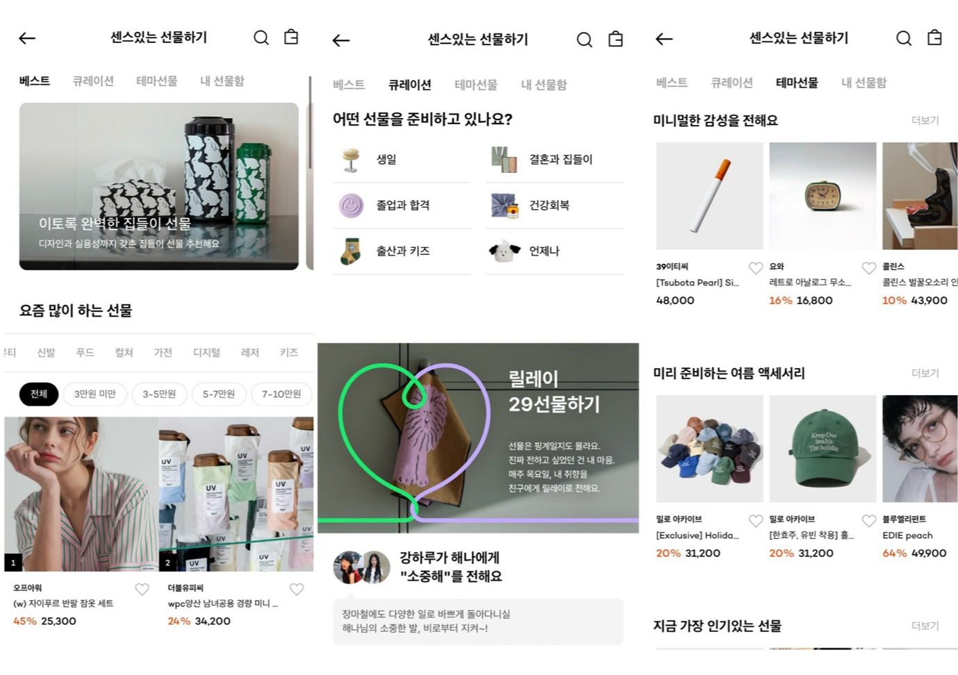 선물하기 서비스에서는 베스트, 큐레이션, 테마선물 3가지의 카테고리로 상품 탐색 방법을 제공합니다.