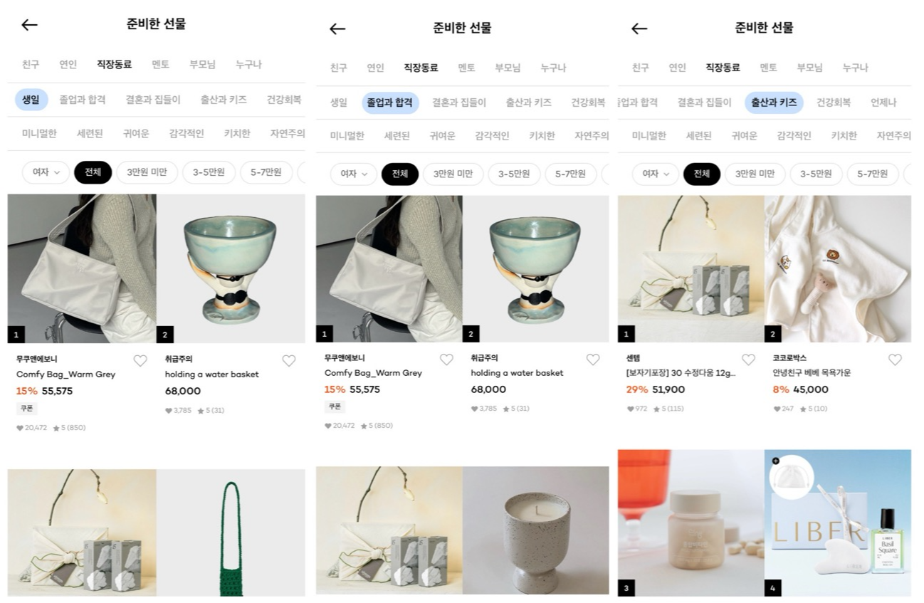 즉, 29CM는 구매자가 선물 후기를 작성하도록 하여 선물로서의 만족도를 파악하기 어려우며, 데이터를 통한 선물 추천 기능의 활용도 부족한 것을 알 수 있습니다.