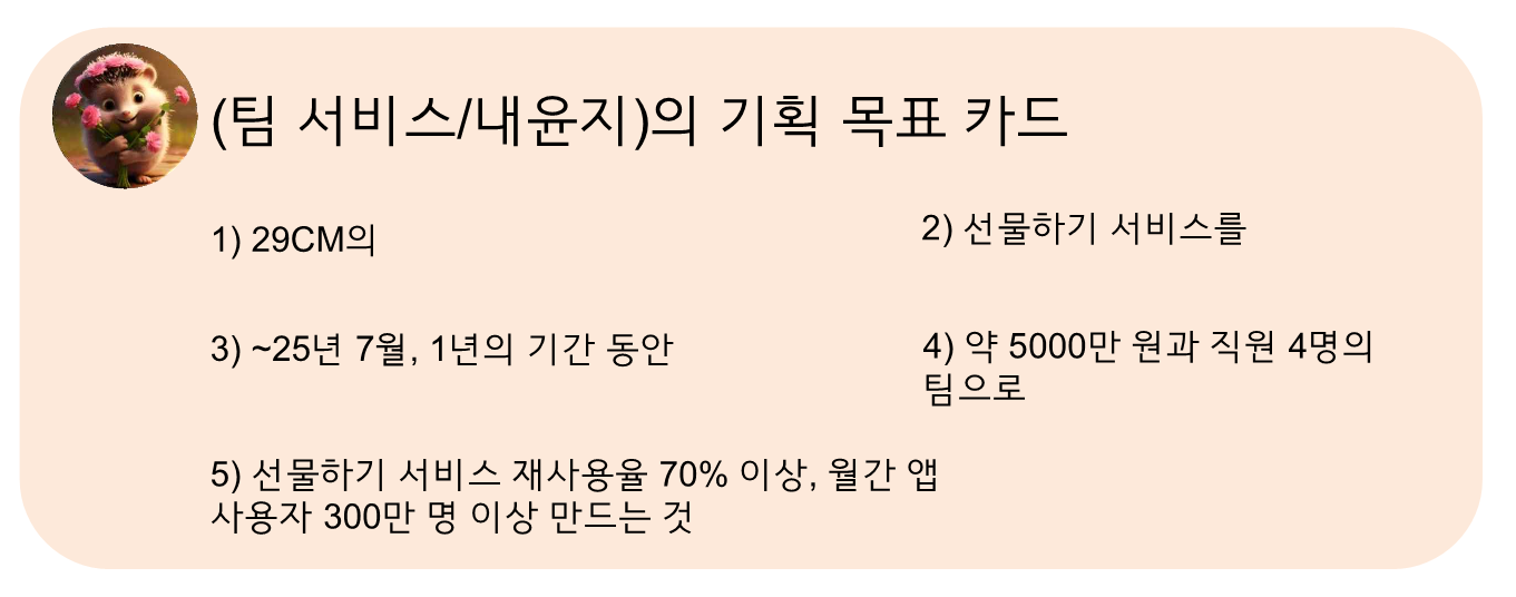 위 목표는 29CM만의 정체성을 유지하며, 자체 서비스인 선물하기 서비스를 활용한 충성 고객 유치를 통해,