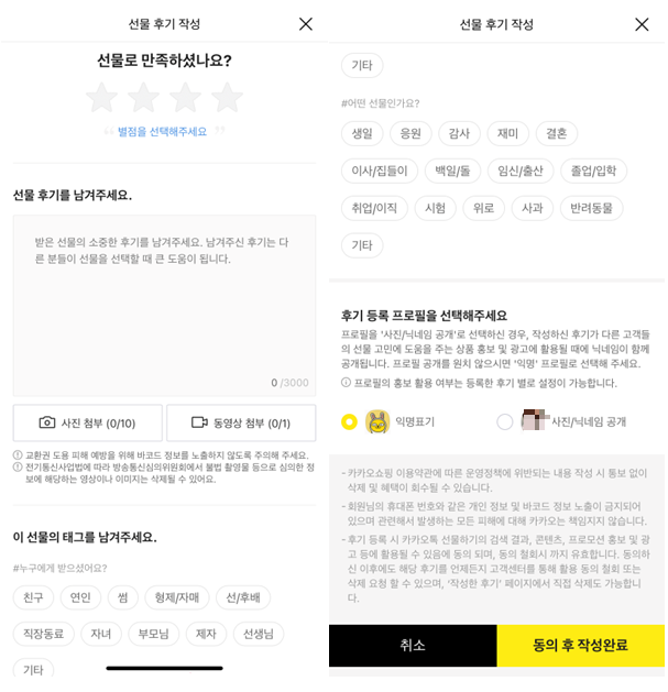 카카오는 “선물을 구매하는 이용자들에게 실사용자들의 정보와 후기를 제공해 구매에 도움을 주고 수신자의 선물 만족도를 높여 구매자와 선물을 받는 이 모두 만족할 수 있는 서비스를 만들기 위해서 도입했다”고 취지를 설명했습니다.