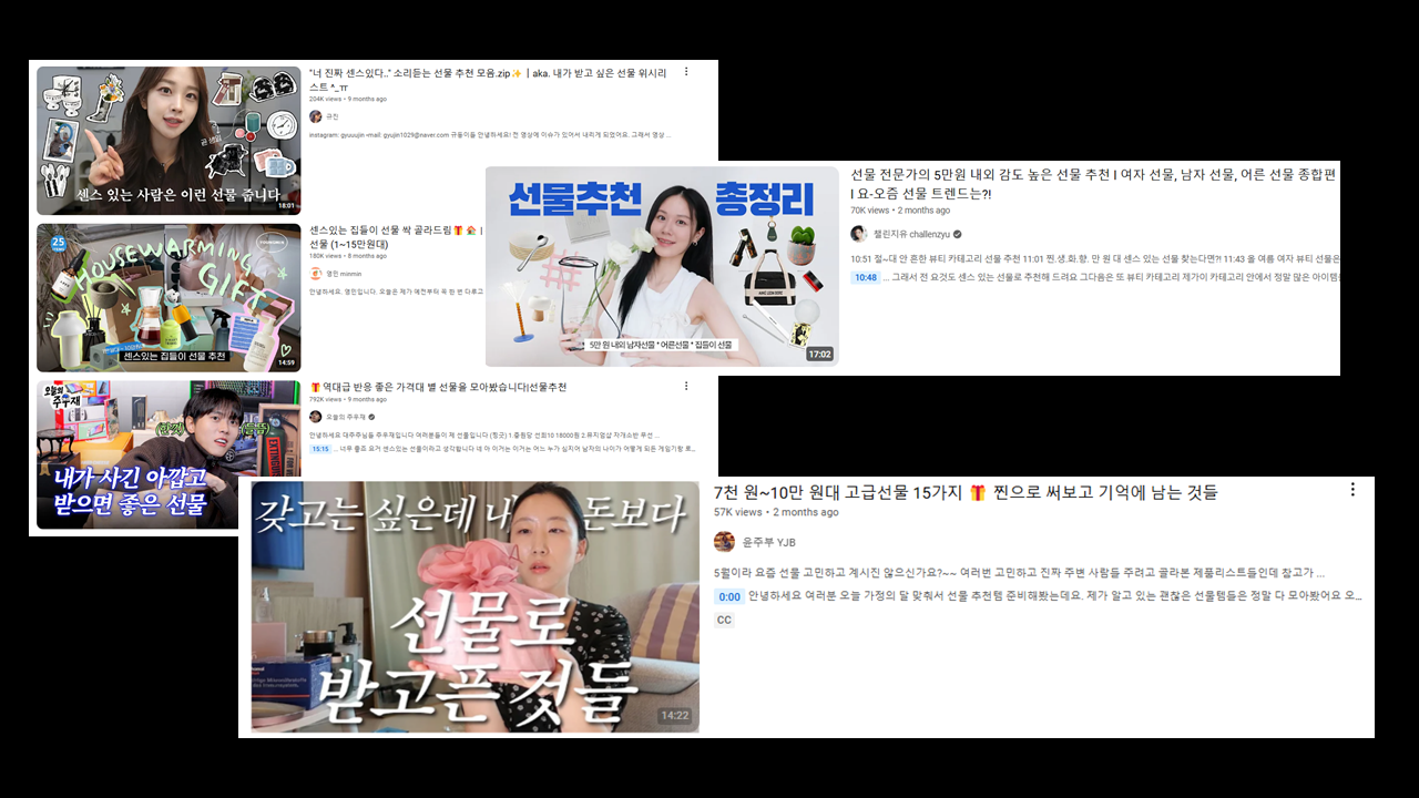 가격대, 상황, 성별, 나잇대 등에 따라 선물을 추천하는 콘텐츠들이 꾸준히 올라오고 있으며
