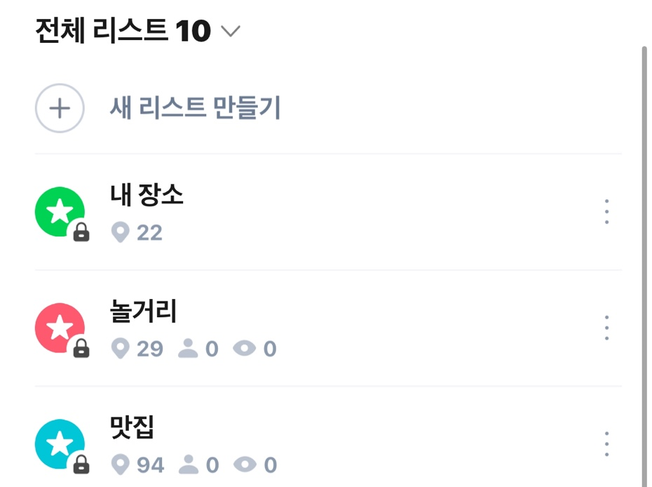 또한 리스트에 따라 다른 색깔의 별로 표시되며, 다른 남색 아이콘으로 표시되는 "즐겨찾기" 와 구분된다는 점이 매우 편리합니다.