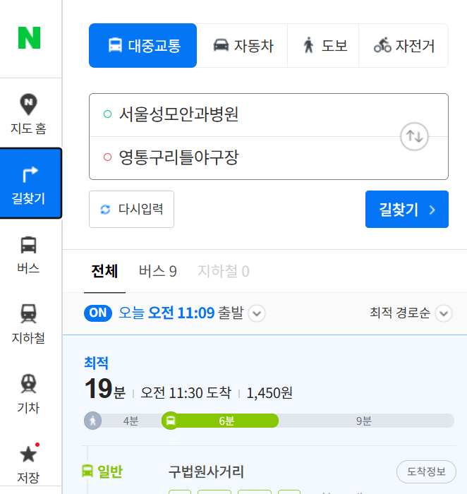 출발 시간을 지정할 수 있고, "최적 경로," "최소 도보" 등 이용자의 편의를 고려한 점이 눈에 띕니다.