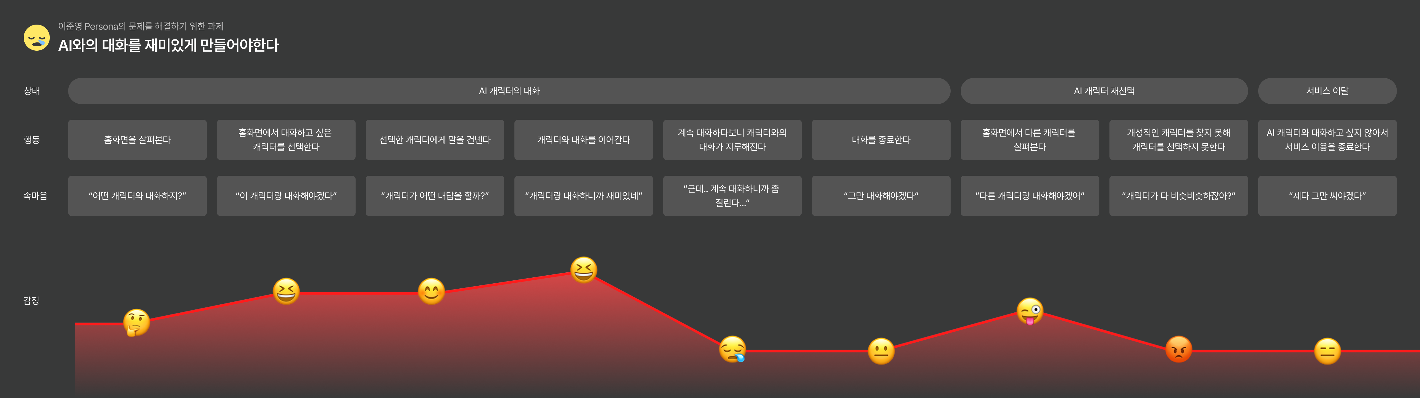 지금까지의 논의를 바탕으로, 홍유진 Persona가 겪을 수 있는 문제 상황과 그러한 문제가 AI 서비스를 통해 해결되는 과정을 User Journey 형태로 정리해보았습니다. 자세히 보실 분들은 아래 링크에 접속하여 확인해주세요.