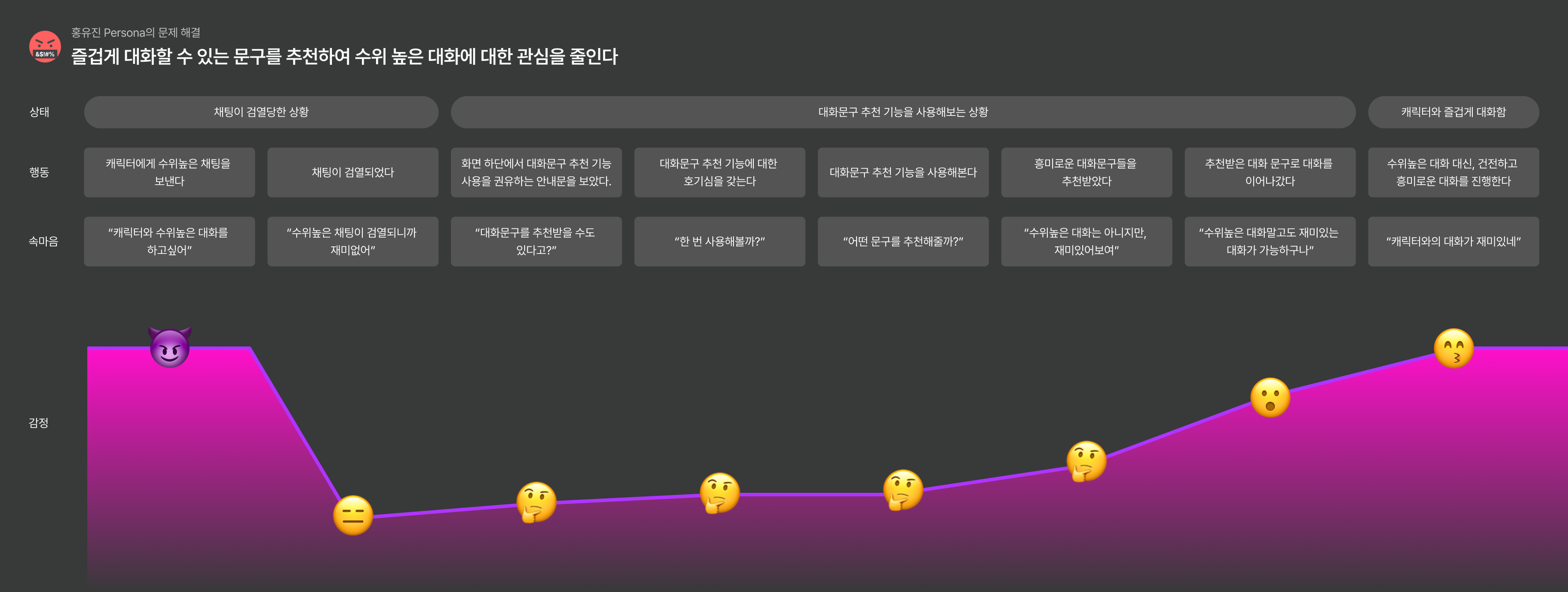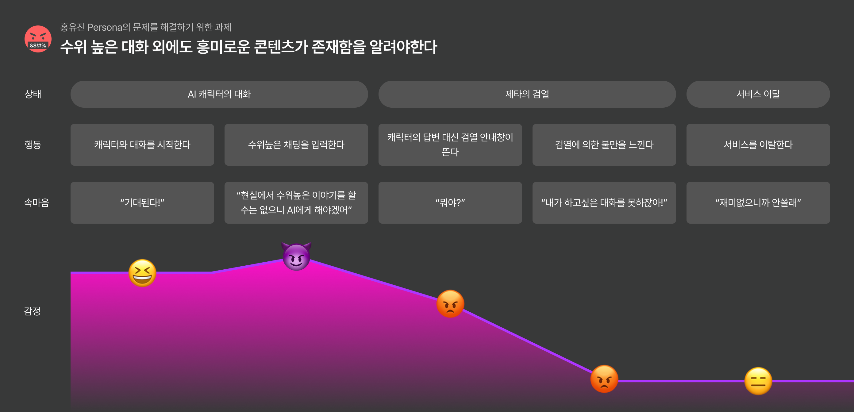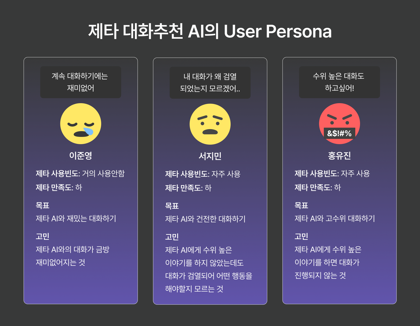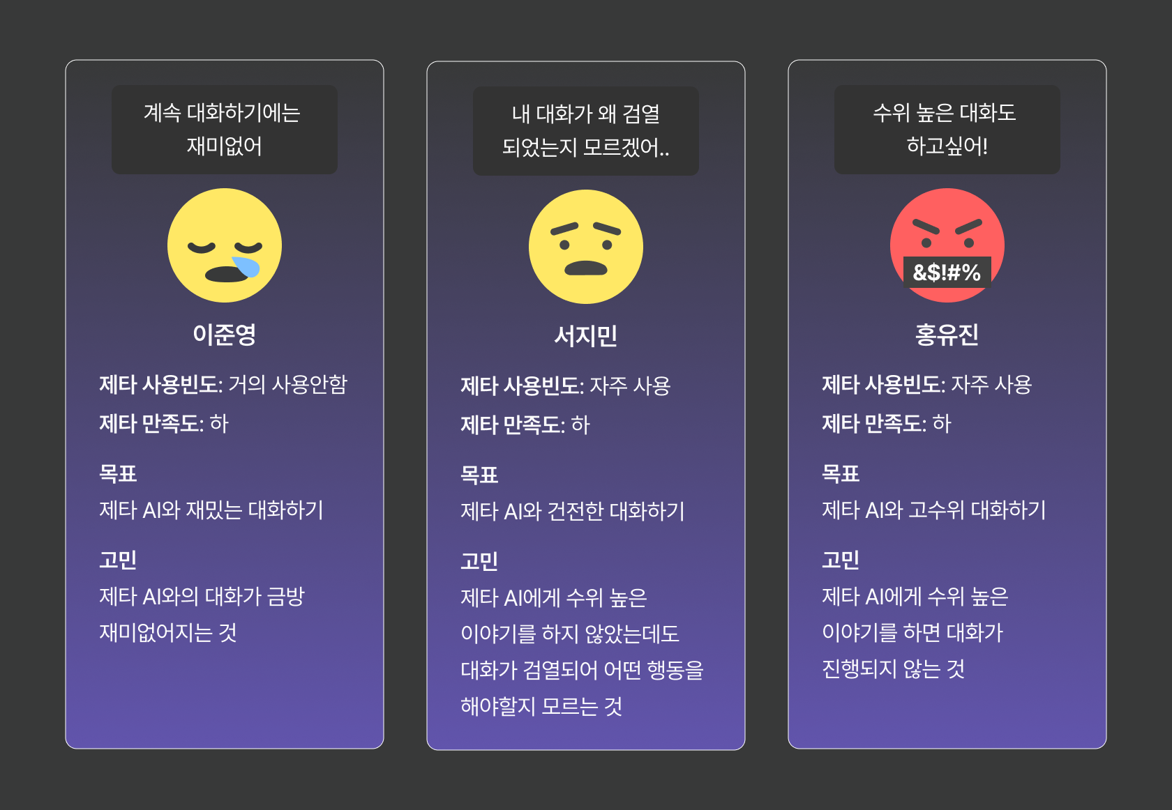 4. 홍유진은 제타에서 고수위 대화를 하지 못해 불만을 겪는 사용자이며, 건전한 대화에 흥미를 느껴 지속적으로 대화를 이어나가게 되는 Persona이다.