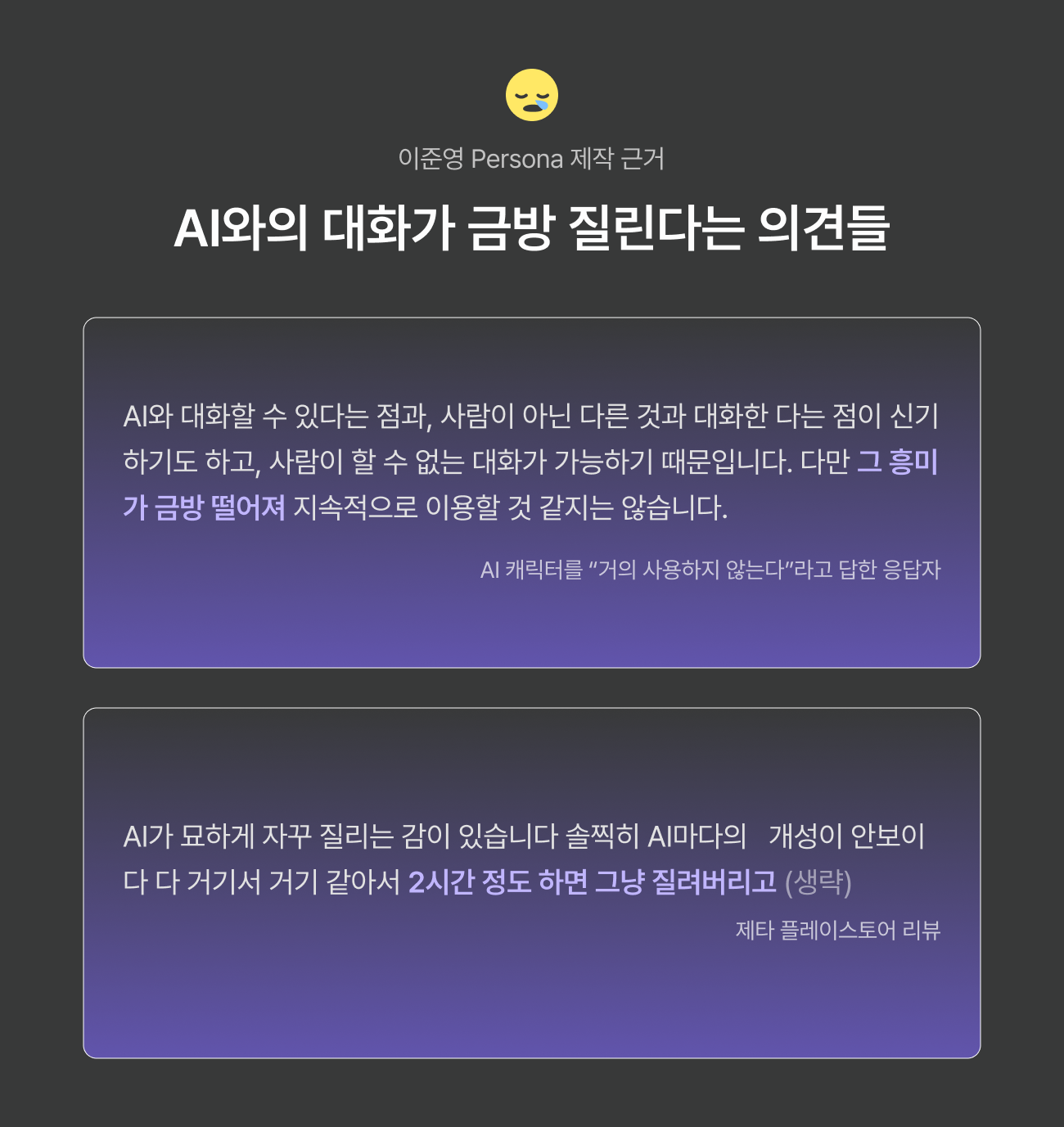 AI 캐릭터와 계속 대화를 이어가기 위해서는 흥미가 지속되는 것이 중요합니다. 하지만 AI 캐릭터와 거의 대화하지 않는 응답자를 인터뷰한 결과, 흥미가 지속되지 않아 사용을 그만두었다고 합니다. 그리고 제타 사용자의 리뷰 중 하나는 제타의 AI 캐릭터의 개성이 부족해 2시간정도 하면 질려버린다는 의견을 표현했습니다.