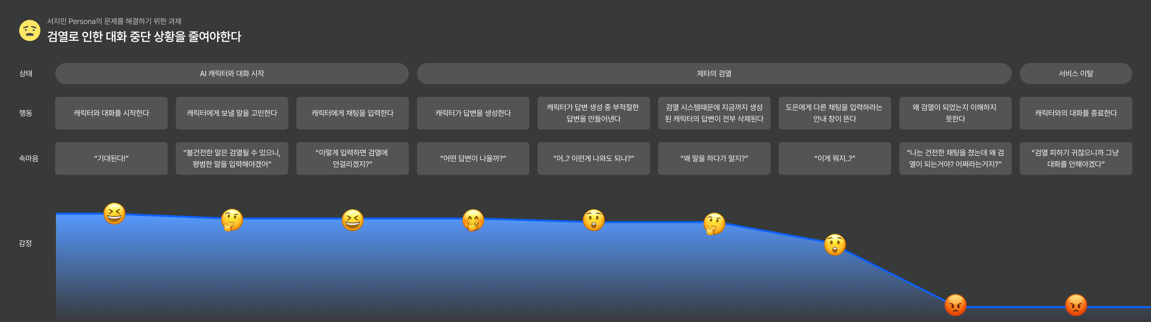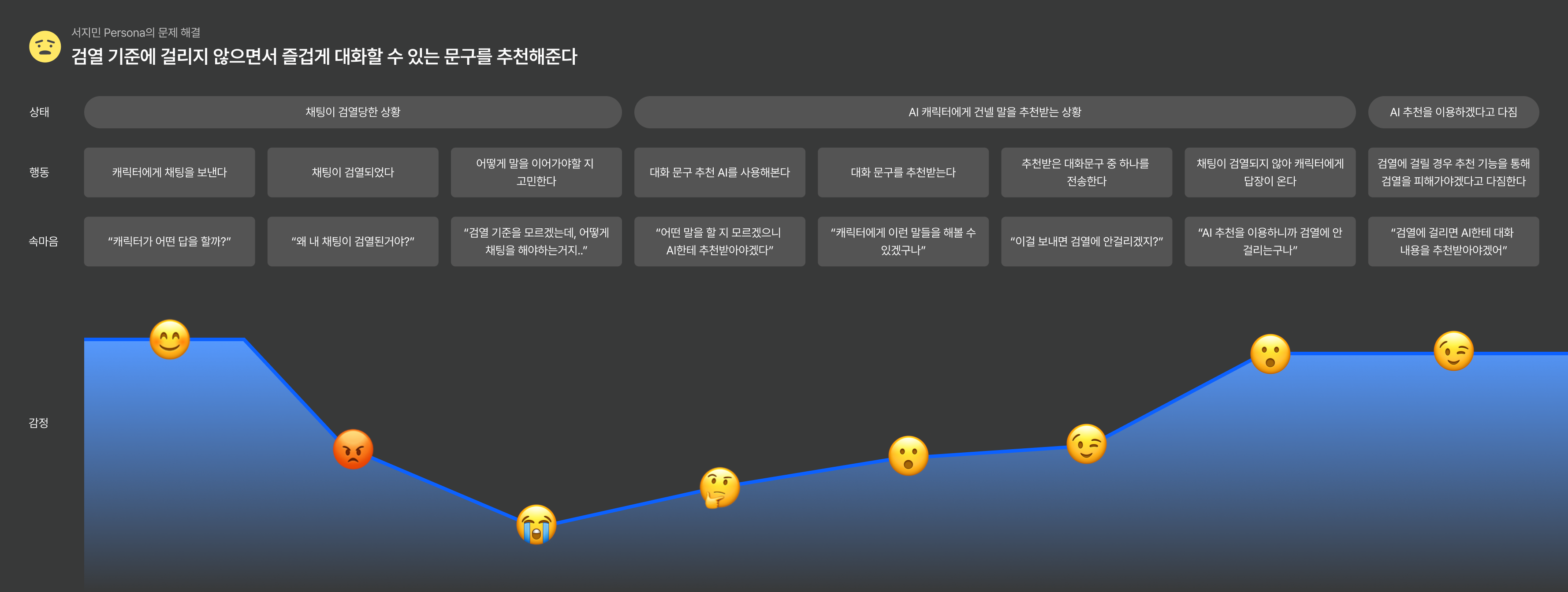 유닛 1에서는 AI 대화 서비스 "제타(Zeta)"의 사용자 리뷰 분석을 통해 많은 사용자들이 검열로 인한 대화 중단에 불만을 겪고 있었음을 확인했습니다. 그래서 대화 끊어짐 현상을 완화할 수 있는 대화 문구 추천 AI를 기획하는 것을 목표로 선정했습니다.