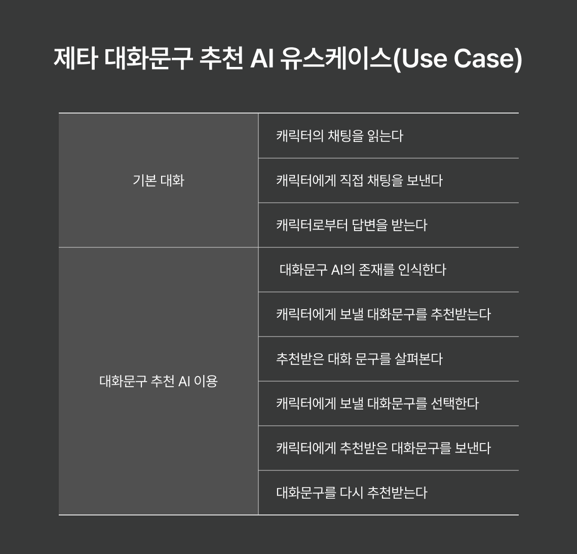 1. 유스케이스는 제타를 사용하고 있는 사용자들이 이미 취하고있는 행동들인 "기본 대화", 이번 기획에서 새로 추가될 사용자 행동들인 "대화문구 추천 AI 이용"으로 구분된다.