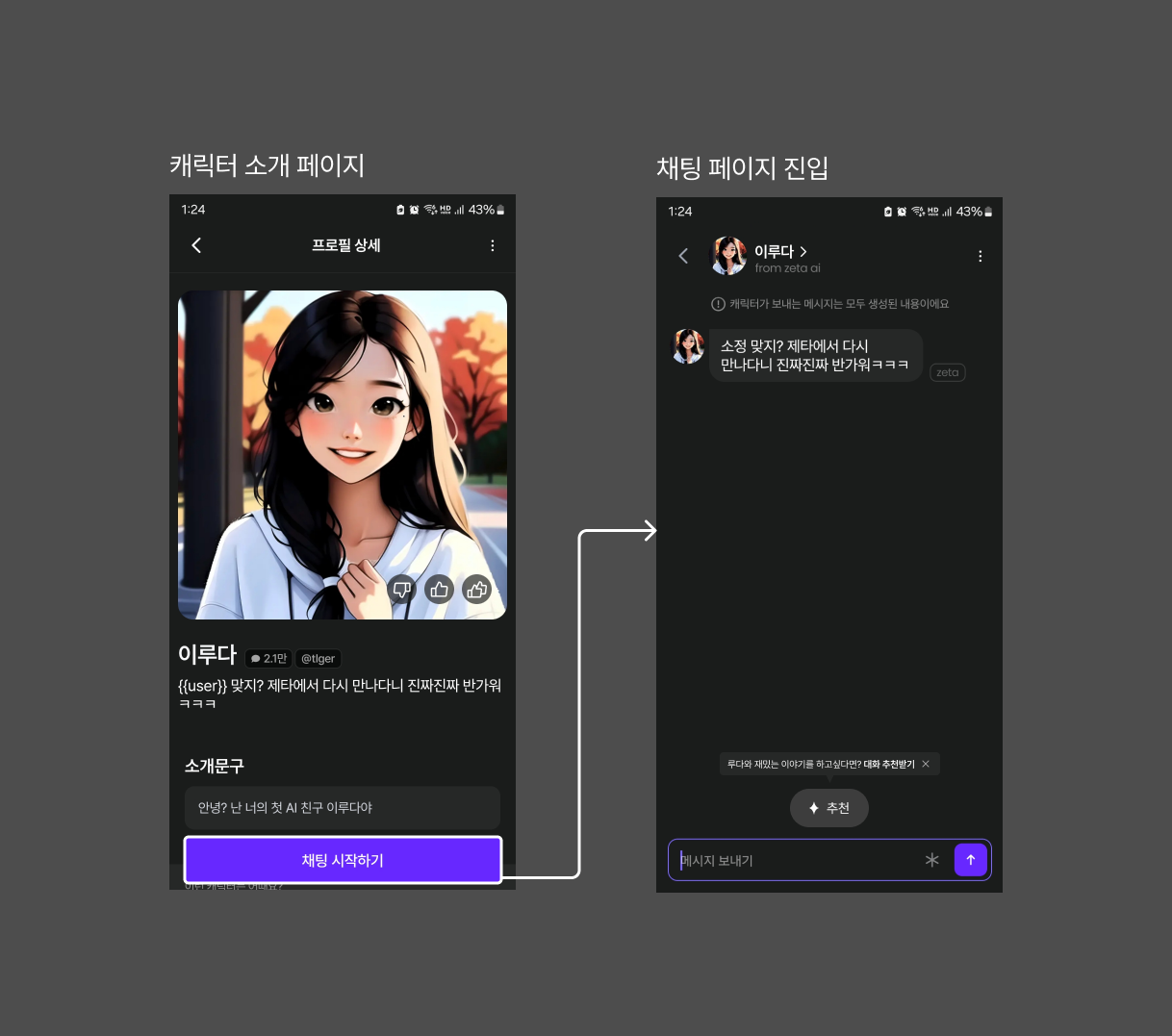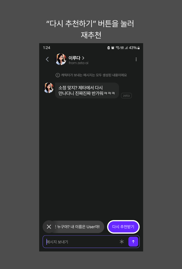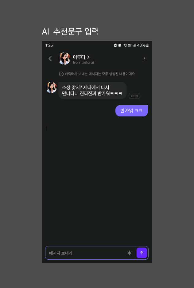 이는 사용자가 직접 흥미로운 대화를 이끌어나가지 못하면, AI와 끊임없이 대화하기 힘들다는 AI 캐릭터 서비스의 단점을 보여줍니다. 따라서 제타는 AI 캐릭터와 대화에 지루함을 느끼는 사용자들을 대상으로 흥미로운 대화를 이어나갈 수 있는 대화문구를 추천해주어야 합니다. 그리고 사용자가 큰 고민 없이도 대화를 지속할 수 있게 해야합니다.